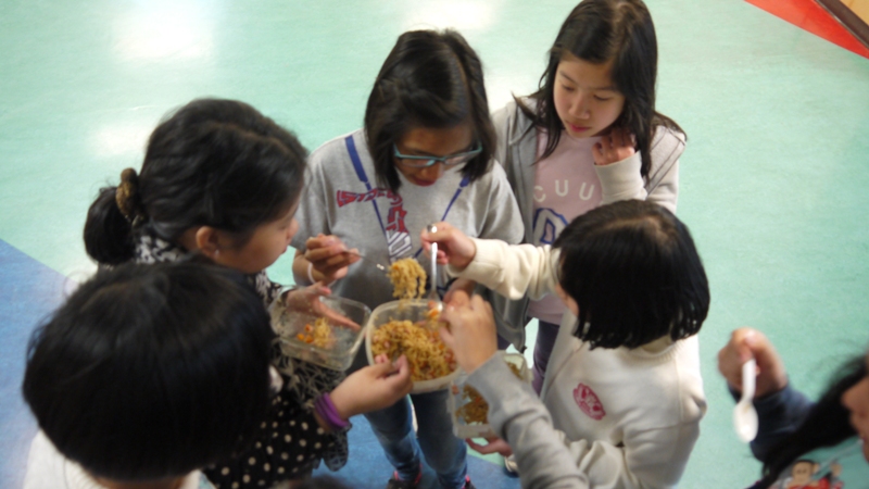 แล้วทุกคนก็เดินเข้าโรงเรียนค่ะ ไปเปิดมาม่าผัดทานกัน เปิดเสร็จ ส้อมพร้อม ทุกคนทานกัน ครูกั๊กยืนลุ้นรอ feedback.. เงียบกริบค่ะ เงียบจริงๆ จนต้องถามว่า เป็นไงมั่งค้า ทำไมเงียบไปเลยยย เด็กๆถึงหันมาบอกค่ะว่าอร่อยมากเลย เลยยังไม่อยากพูดตอนนี้ จะทานก่อน.. ครูกั๊กดีใจมากค่าาา ใครหลอกไม่หลอกไม่รู้ แต่เดี๋ยวจะทำอย่างอื่นมาให้ได้ทานกันอีกค่ะ ฮี่ๆ