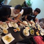 เมนูที่ครูทั้งสองคนช่วยกันคิดก็มี ไข่เจียว กระเพราหมูสับ ผัดผักรวม ต้มยำกุ้งน้ำข้น แล้วก็แกงเขียวหวานไก่ค่ะ อย่างแรกที่มาคือต้มยำกุ้งค่ะ ลงโต๊ะปุ๊บ.. หายเกลี้ยง จานที่สองคือไข่เจียว ลงโต๊ะปุ๊บ.. หาย แล้วเมนูอื่นๆก็ไล่ตามๆกันมา ไม่ได้ยินเสียงคนคุยกันเลยค่ะ ได้ยินแต่เสียงก๊องแก๊งๆของช้อนส้อมกระทบกับจาน ผ่านไปซักครึ่งชม. เริ่มมีเสียงคนคุยกันละ ครูกั๊กเลยแซว.. อ้าว คุยกันแล้วเหรอคะ เด็กๆตอบมา.. ก็เริ่มอิ่มแล้วอ่ะครู 555 เรายังคงสั่งไข่เจียวและข้าวสวยเพิ่มอยู่เรื่อยๆค่ะ ทานกันเยอะมากจริงๆ แม่ครัวทำแทบไม่ทัน