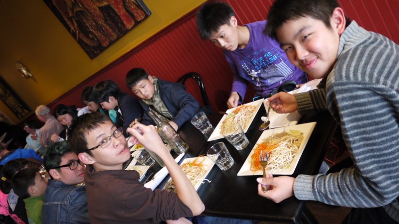 ช่วงเย็นหลังเลิกเรียน ครูกั๊กก็จะนัดน้องๆที่โตหน่อยไปเจอกัน ทานข้าวด้วยกันบ้าง ทุกคนมีเรื่องที่โรงเรียนมาเล่าให้ฟังทุกครั้งที่เจอกัน วันนี้เรียนสบาย วันนี้เรียนเยอะ วันนี้ไม่มีการบ้าน วันนี้การบ้านเพียบ แต่ละคนเล่ากันไม่ซ้ำแบบเลย สนุกดีค่ะ ได้ติดตามความเป็นไปของทุกคนแบบ inside กันเลยทีเดียว ส่วนเวลาทานข้าวด้วยกัน ทุกคนก็เต็มที่ สั่งมาเดี่ยวบ้าง แชร์กันบ้าง ตอนคิดสตางค์ก็จะใช้เวลานานกว่าปกติเพราะทุกคนงงค่ะ เราก็จะมีเหรัญญิกประจำกลุ่มช่วยกันคิด บวกลบคูณหาร เมื่อได้ราคาที่ถูกต้องแล้วทุกคนก็จะงัดแบงค์ขึ้นมาแถมด้วยเหรียญอีกตั้งใหญ่ๆ นานตรงนี้แหล่ะค่ะ นับเหรียญ มีทั้ง 1 cent 5 cents 10 cents 25 cents 1 dollar และ 2 dollars ก็เรียกได้ว่าเป็นการเรียนรู้คณิตศาสตร์นอกห้องเรียนอย่างจริงจังกันเลยทีเดียว ครูกั๊กก็ได้ฝึกไปกับเค้าด้วยค่ะ ใช้เหรียญกันก่อนดีกว่าครููกั๊กบอก เดินไปเสียงเหรียญกระทบกันกรุ๋งกริ๋งๆ งัดขึ้นมาจ่ายเลยดีกว่า อย่าไปสะสม สะสมแบงค์จะดีกว่าเนอะคะ