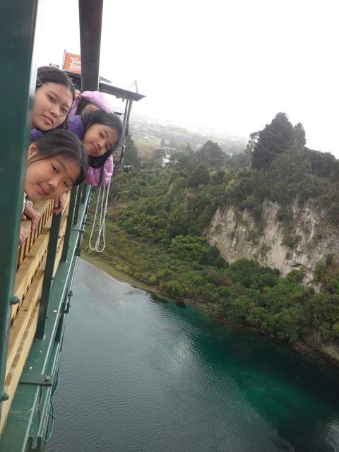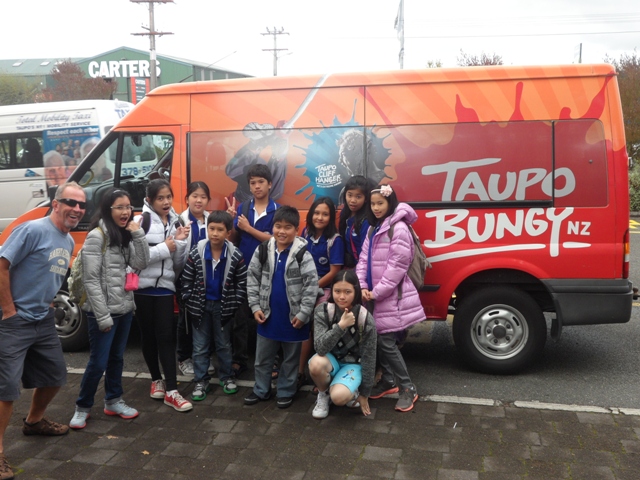 เราไปถึงน้ำตกที่ค่อนข้างใหญ่และสวยงาม Huka Falls เป็นจุดแรก เด็กๆ ตื่นเต้นกับสายน้ำสีเขียวสวยที่ไหลเชี่ยวกราก เราเดินเก็บภาพกันซักระยะ เมื่อกลับมาที่รถบัส ปรากฏว่ารถสตาร์ทไม่ติด โชคดีเป็นที่สุดที่มีเจ้าหน้าที่จาก Intermediate School คือ Ms.Barbara และ Ms. Monica คอยตามมาช่วยดูแลด้วย เราก็เลยได้เรียกใช้บริการรถ taxi van ของเมือง Taupo ซะเลย เราได้ไปเที่ยวต่อที่สถานที่ที่กระโดดบันจี้ เด็กๆ ได้เห็นสถานที่จริงคือหน้าผา และ แม่น้ำสายใหญ่ หนึ่งสาวน้อยผู้กล้าอยากจะขอลองกระโดดซักครั้ง