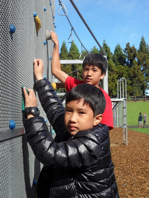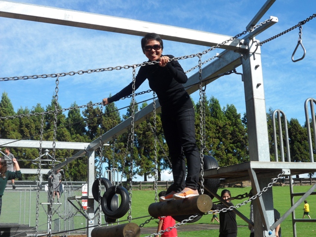 ช่วงพักทานกลางวัน ก๊วน Intermediate ยังมานั่งทานอาหารด้วยกันอย่างเคย Tangkwa&PunPun มี Fejoia ผลไม้พื้นเมืองของชาวกีวีมาฝากครู Oaky บอกว่าที่บ้านก็มีลูกโตกว่านี้นิดนึง หลายคนขอชิมแล้วก็ติดใจในความหอมหวาน พี่บูมบอกว่าคล้ายน้อยหน่า ครูบี๋ว่าเหมือนฝรั่งสุก พอทานกลางวันเสร็จเด็กๆ ก็ชักชวนกันไปประลองความกล้าที่สนามเด็กเล่น หลายคนพยายามลองเล่นเครื่องเล่นใหม่ๆ Poon ที่ตัวเล็กสุดและมีประสบการณ์การตกจากไต่เชือกมาแล้ว..แนะนำกึ่งขอร้องให้ครูบี๋ลองเล่นดูบ้าง หลังจากนั้นเราก็เลยปีนป่ายเป็นลิงแข่งกับชาวกีวีกันอย่างสนุกสนาน ส่วนฝั่ง College ก็นัดแนะมานั่งล้อมวงทานด้วยกันครบหน้า ไม่มีใครหายหน้าไปไหน เพราะพี่บูมนัดแถลงเรื่องที่จะต้องเตรียมตัวก่อนไปเที่ยวในวันพรุ่งนี้