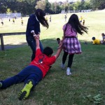 ลงไปดูที่สนามกันบ้าง วันนี้มีห้องแตงกวาเรียนเทนนิส ห้องเกรซและต๊อปเรียนเบสท์บอลค่ะ ซึ่งทั้งสองคนตีโดนด้วยน๊า….เด็กฝรั่งฮือฮาเลย เพราะบางคนยังตีไม่โดนด้วยซ้ำ แต่ตอนพักเที่ยงนี่สิคะที่ฮา………. คือครูปัดสั่งไว้ว่าไปกินข้าวกับเพื่อนๆ บัดดี้นะลูก ไม่ต้องมานั่งกับครูแล้ว ซึ่งเด็กๆ ก็ทำตามค่ะ กินข้าวกับเพื่อนเสร็จปุ๊บก็วิ่งมาหาครูปัดปั๊บ!!!!! ยกเว้นต้นกล้า บิ๊ก กะกันน์ที่ไปเล่นกะเพื่อนๆ และเนื่องจากวันนี้ครูปัดหลบมานั่งที่สนามค่ะ เด็กๆ เลยได้ location ใหม่ในการเล่น โดยเฉพาะทศกะแซมที่วันนี้คึกมากกกกกกกกก ตั้งแต่ปีนต้นไม้จนไปถึงกลิ้งแข่งกันลงมาจากเนิน เท่านั้นไม่พอ ให้เอิร์นกะพราวช่วยลากลงมาอีก สนุกกันจนออดขึ้นเรียนดังเลย!!!!