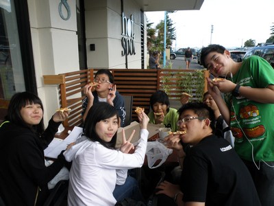 เล่นน้ำเสร็จเด็กบอกอยากไป Mt.Munganui Downtown แต่ครูป้านกลัวว่าจะเสียเวลาเดินไป แล้วก้ต้องรีบเดินกลับ ไม่ทันได้ชอปปิ้ง เพราะใกล้เวลาที่โฮสต์จะมารับแล้ว จึงเดินเล่นกันอยู่แถวๆนั้น ดันไปเจอร้านพิซซ่า ครูป้านถามใครอยากกินมั่ง ครูป้านจะเลี้ยง แหม..ไม่พลาด อยากกินกันทุกคน ก็อิ่มอร่อยไปตามระเบียบ แถมมีบางคนยังไปซื้อไอศครีมร้าน Copenhegen กินอีก ทำไมถึงกินเก่งกันอย่างนี้